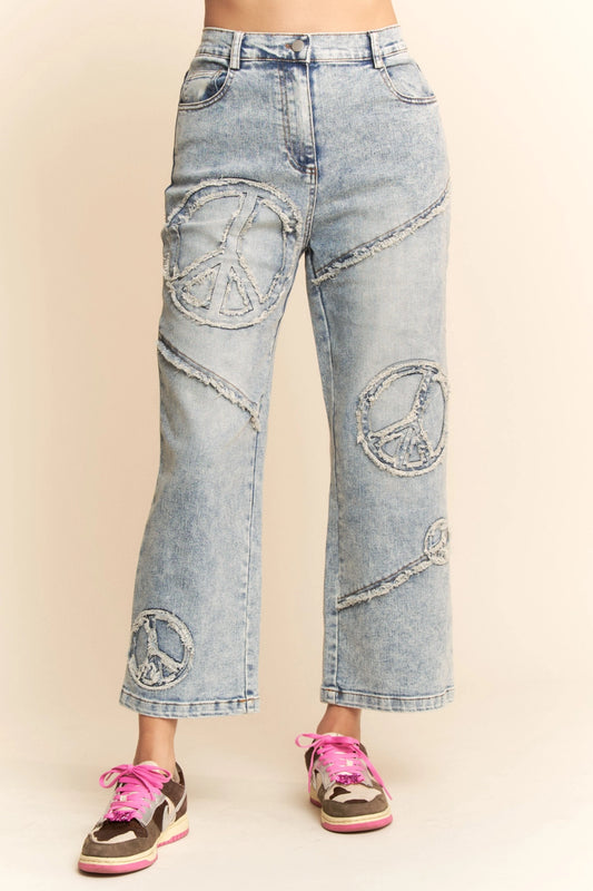 Peace Sign Straight Cropped Light Denim Jeans