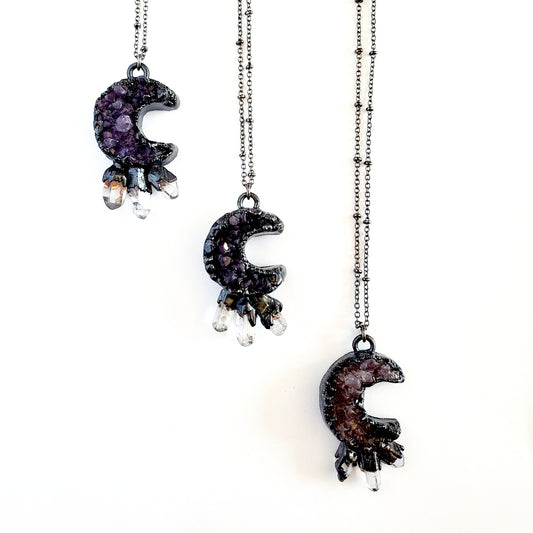Croissant de lune en améthyste et cristal de quartz avec éclat étoilé