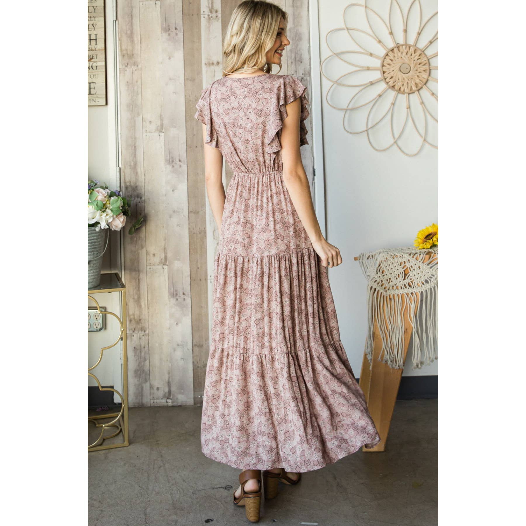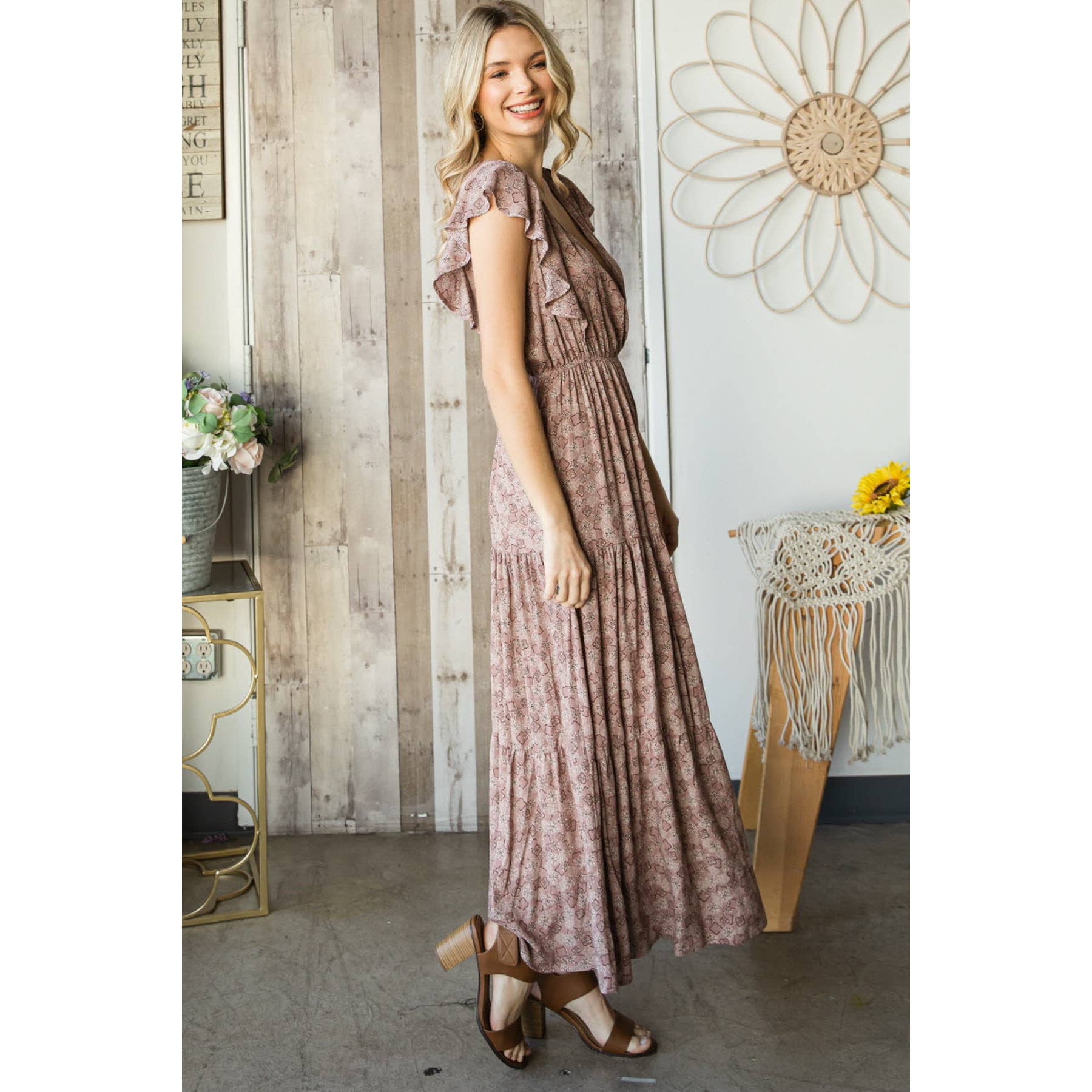 Vous ne trouverez pas de pièce plus époustouflante que cette magnifique robe midi. Polyvalente, elle présente une matière légère et aérienne, un fond mauve avec un imprimé abstrait plus foncé, de luxueux volants sur le haut qui couvrent légèrement les bras, un décolleté en V, une taille cintrée très confortable et une jupe décontractée qui tombe en un ourlet droit jusqu'à la cheville !
