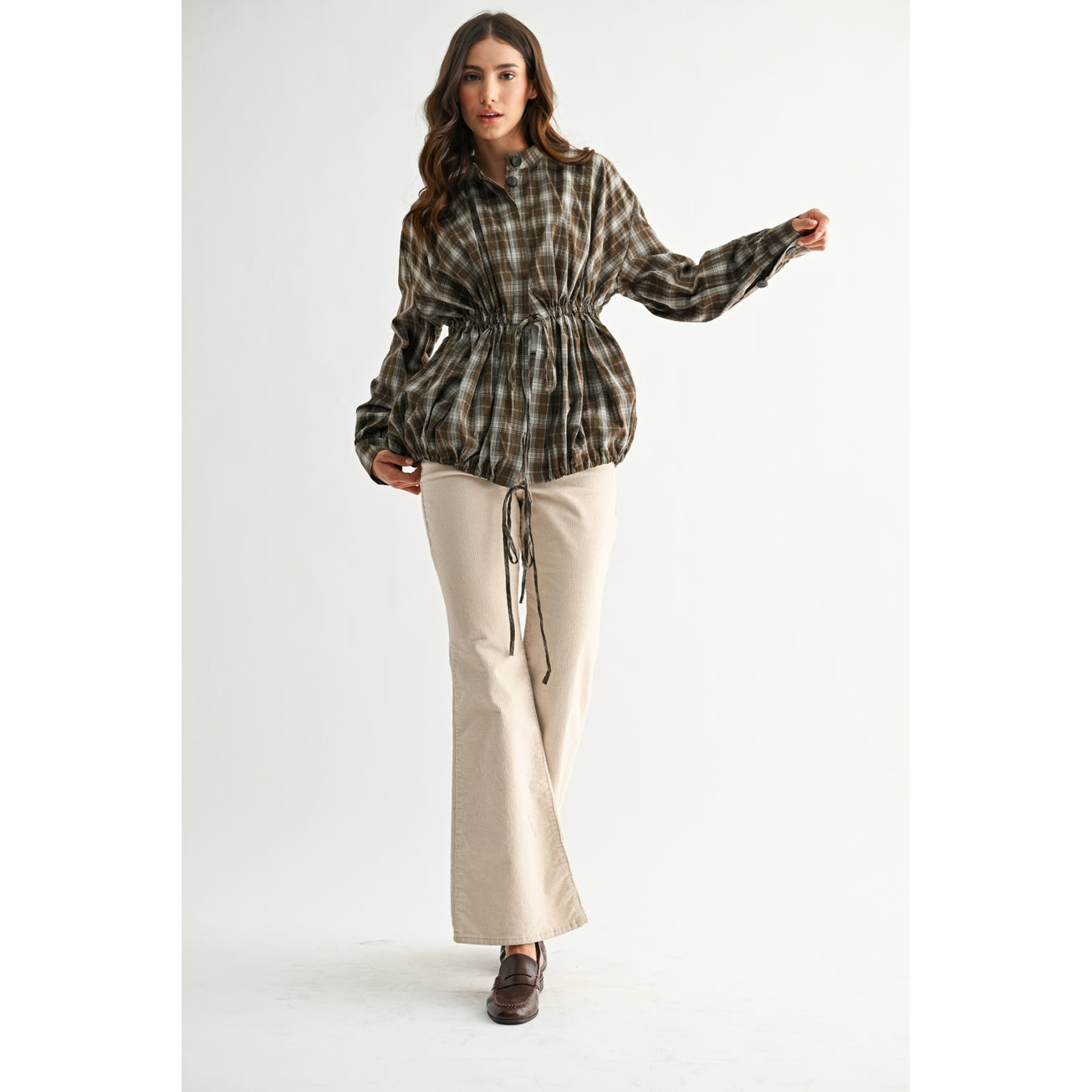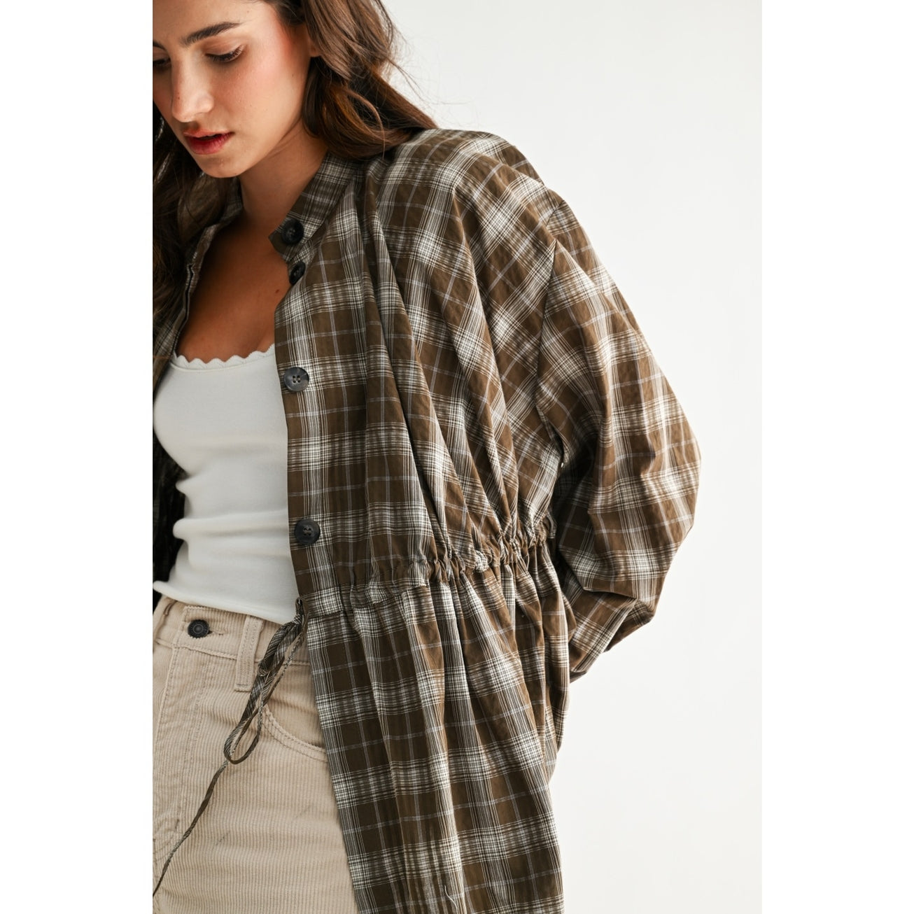 Olive Plaid Drawstring-Waist Jacket