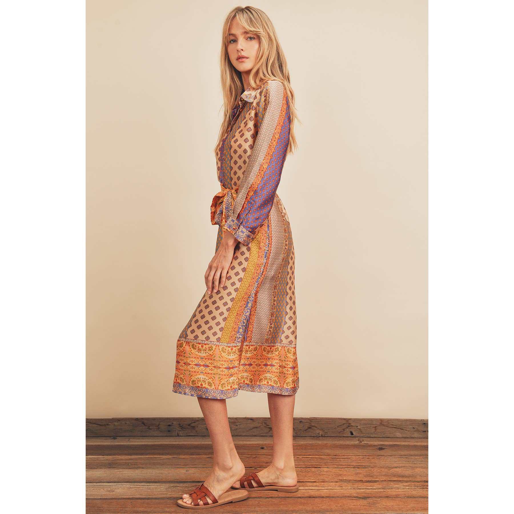 Border print satin dress featuring a collared neckline, front button closures, sash belt, and side slit detail. This dress is unlined. Model is 5`9" and wearing size Small.