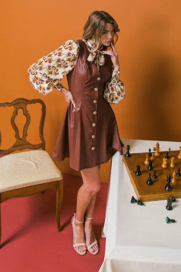 A faux leather mini dress featuring V neckline, sleeveless, button down and A line skirt