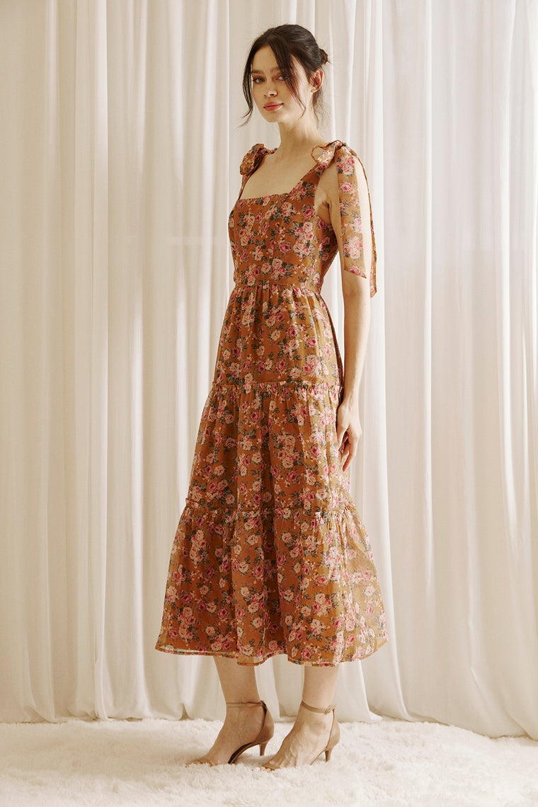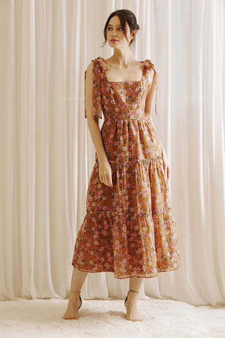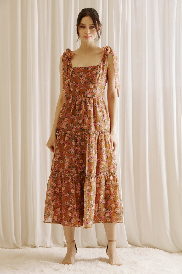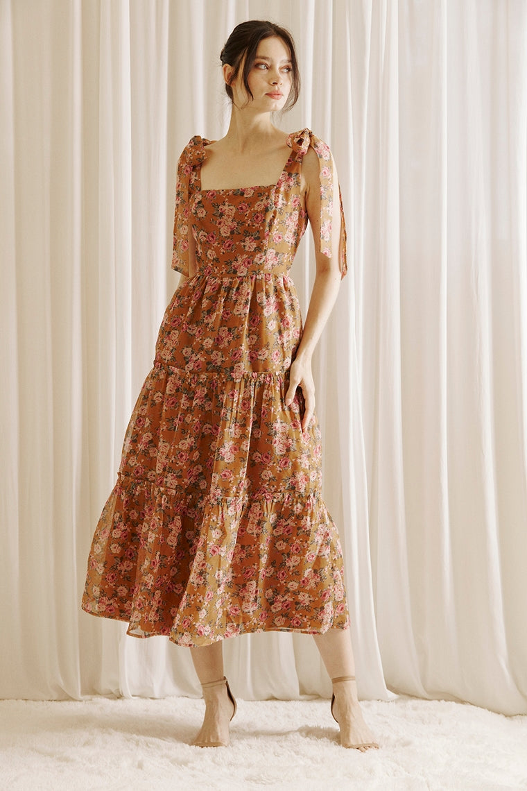 Rose print romantic midi dress. It displays a square neckline, thick self-tie ribbon straps, and back zipper. It also has a ruffled midi bottom.