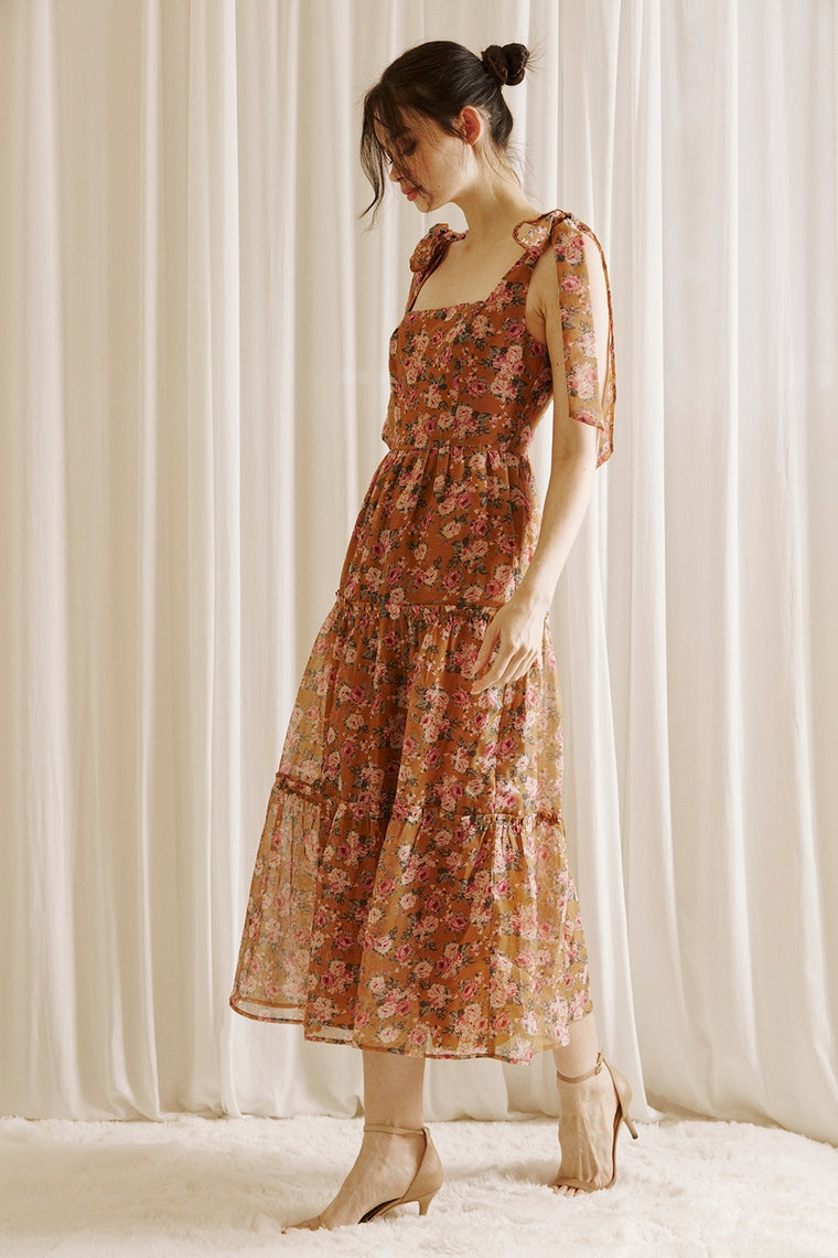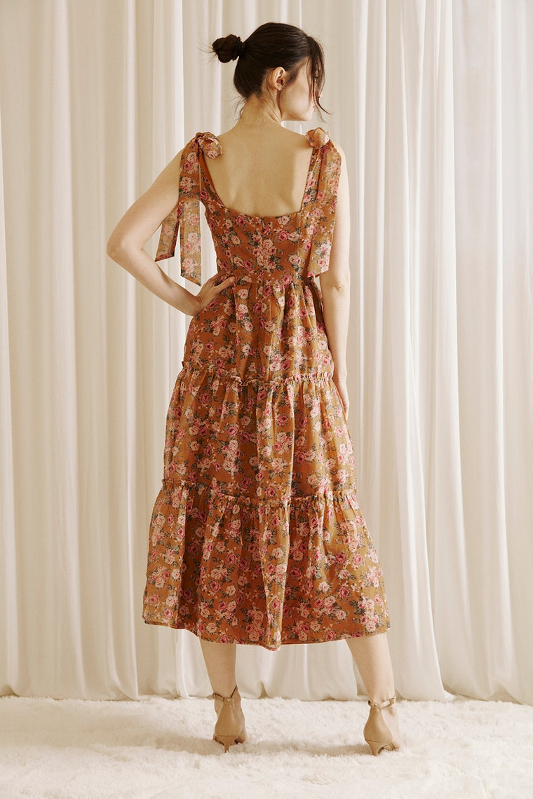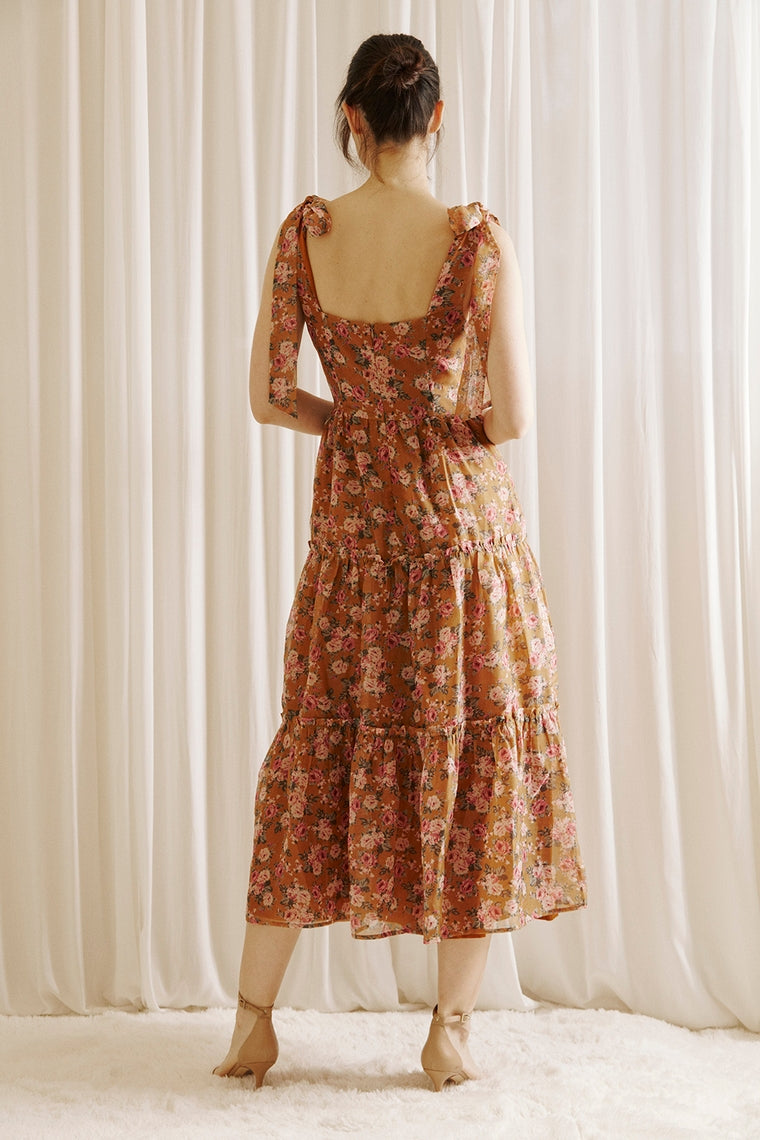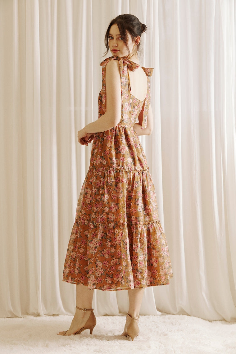 Rose print romantic midi dress. It displays a square neckline, thick self-tie ribbon straps, and back zipper. It also has a ruffled midi bottom.