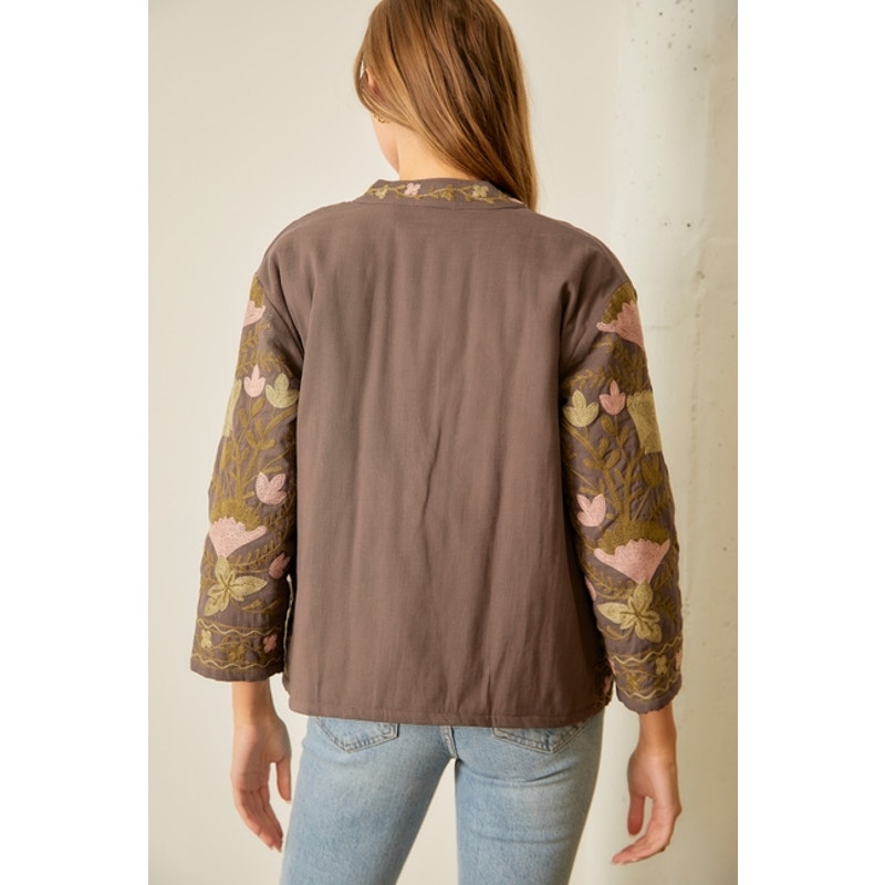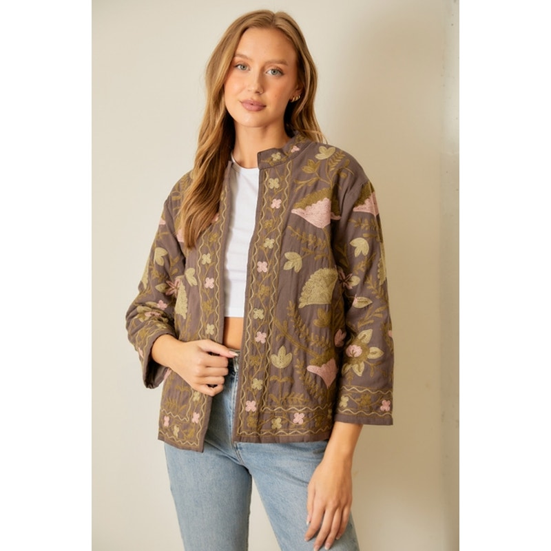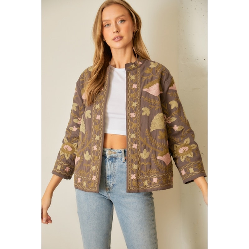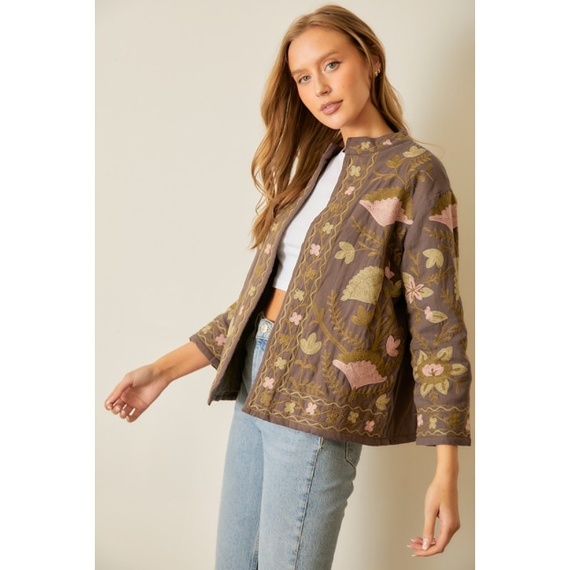 Charcoal Floral Printed Cotton Embroidered Jacket