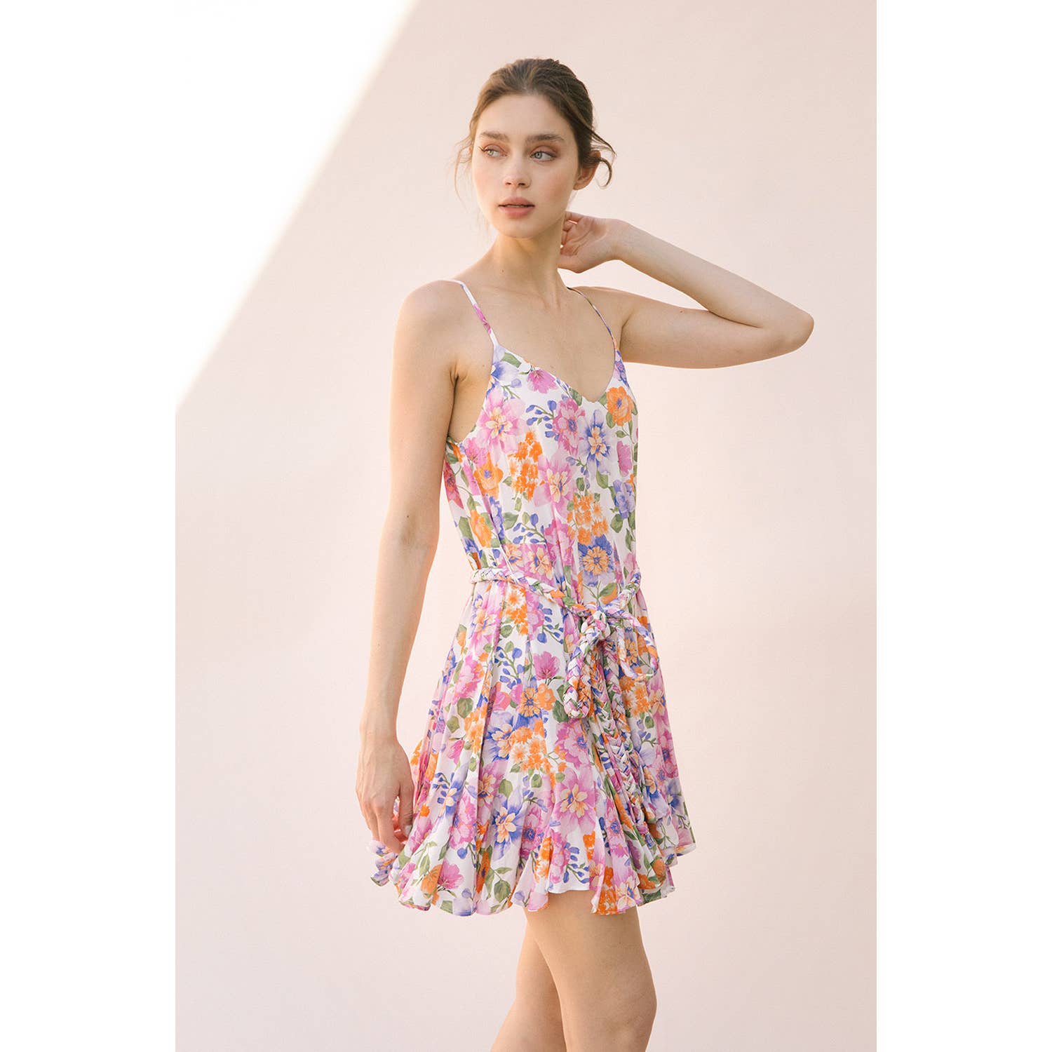 Large warm-colored flower print mini dress. It features a scooped neckline, trapeze and swing silhouette, and adjustable spaghetti straps. It also has a ruffled hem and braided belt to wrap around the waist to cinch it.