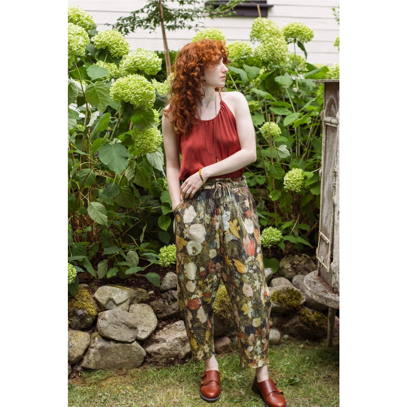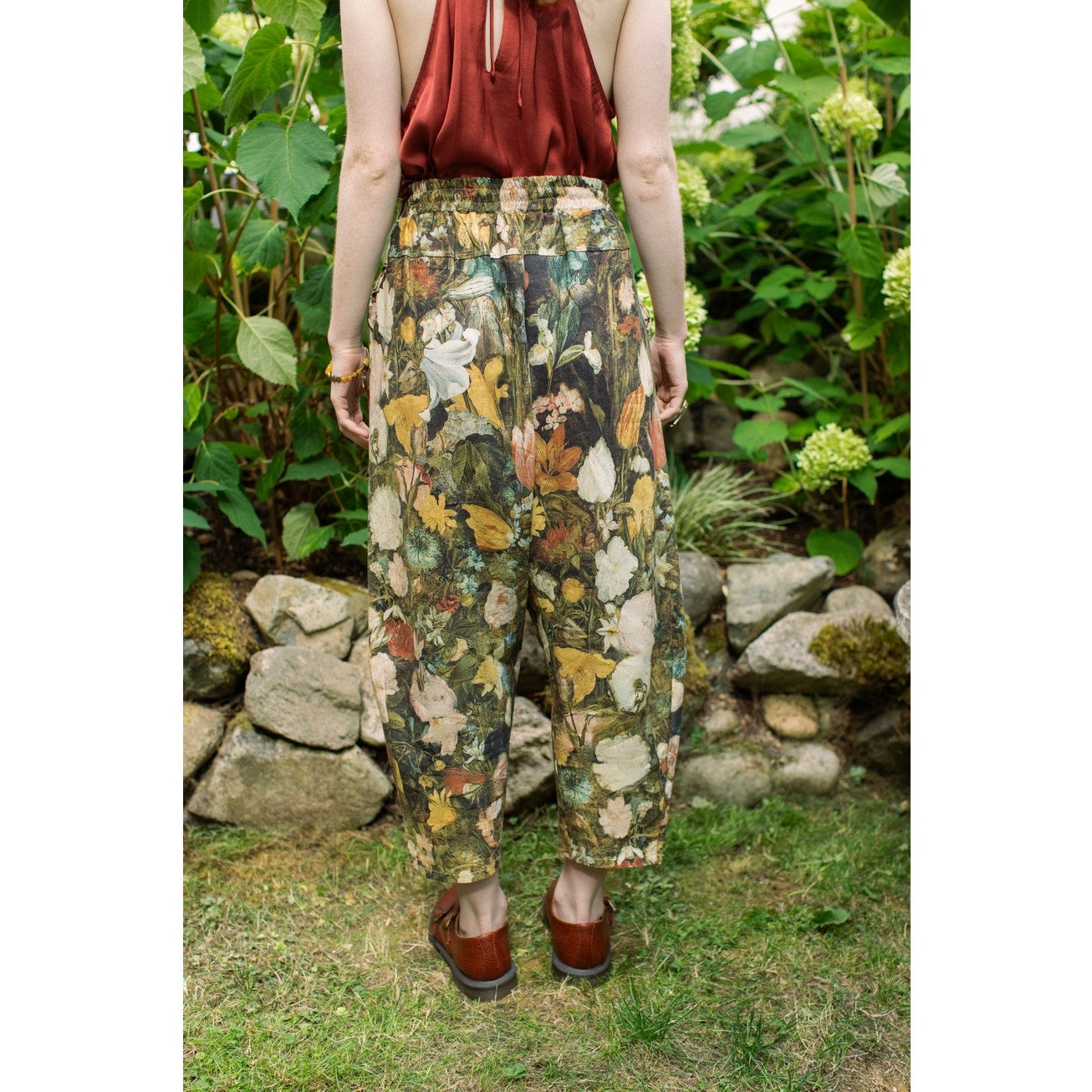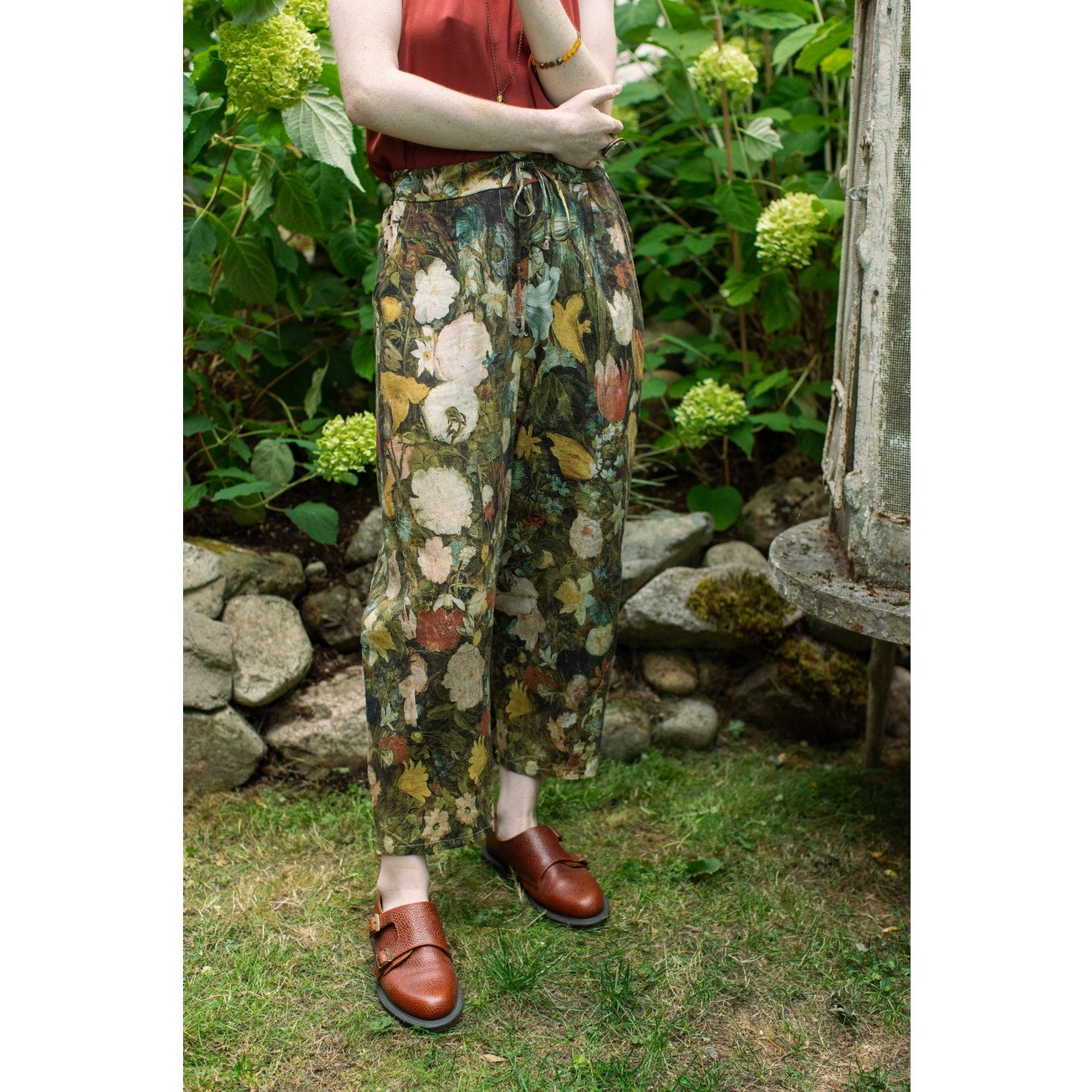 A riotous, painterly celebration of art and the natural world, these Artist Pants are at once romantic, ethereal, and so cool. Inspired by the romance of European flower markets, we created the print using a masterful oil painting from the early 1600’s by artist Jan Brueghel, and an ink drawing of bumblebees we found in a Victorian encyclopedia. Dress them up with a silk tank & blazer, or down with a cropped sweater and sneakers— either way, expect compliments!
