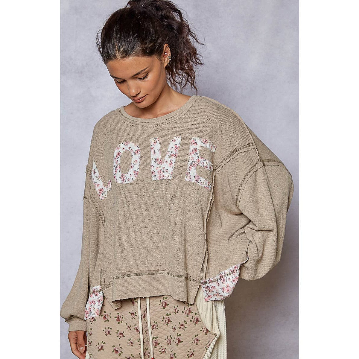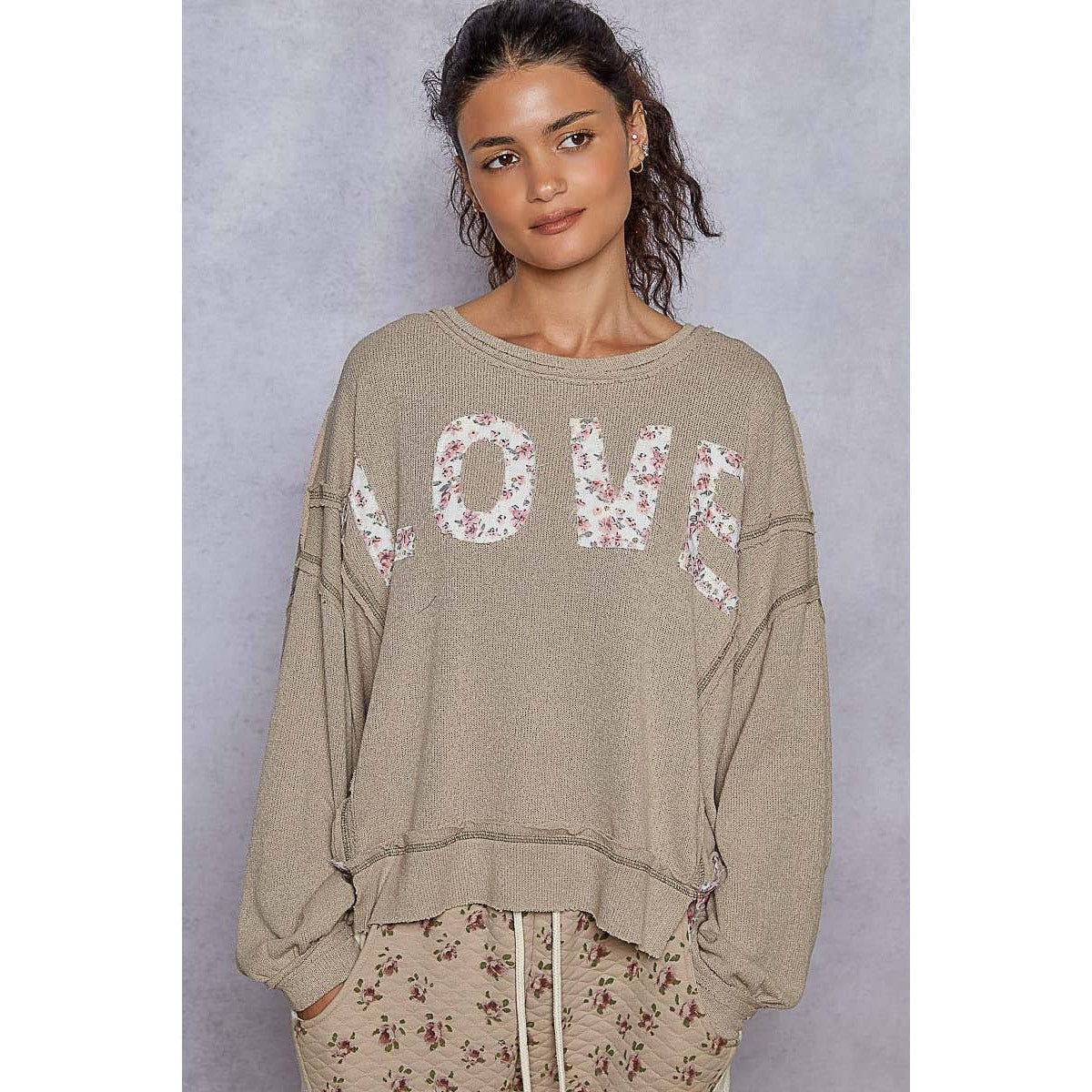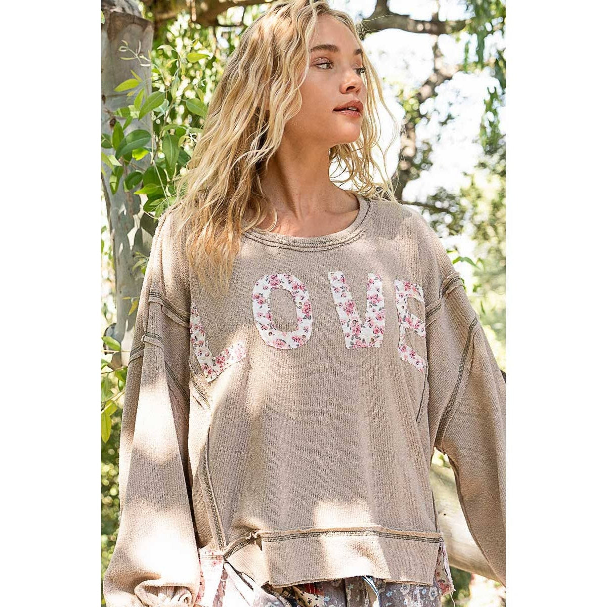 Designed in round neck long sleeve regular fit top in cut and sew sweater knit with out seam, LOVE letter patch, overlock stitch point, out seam detail, vintage washing, solid color.