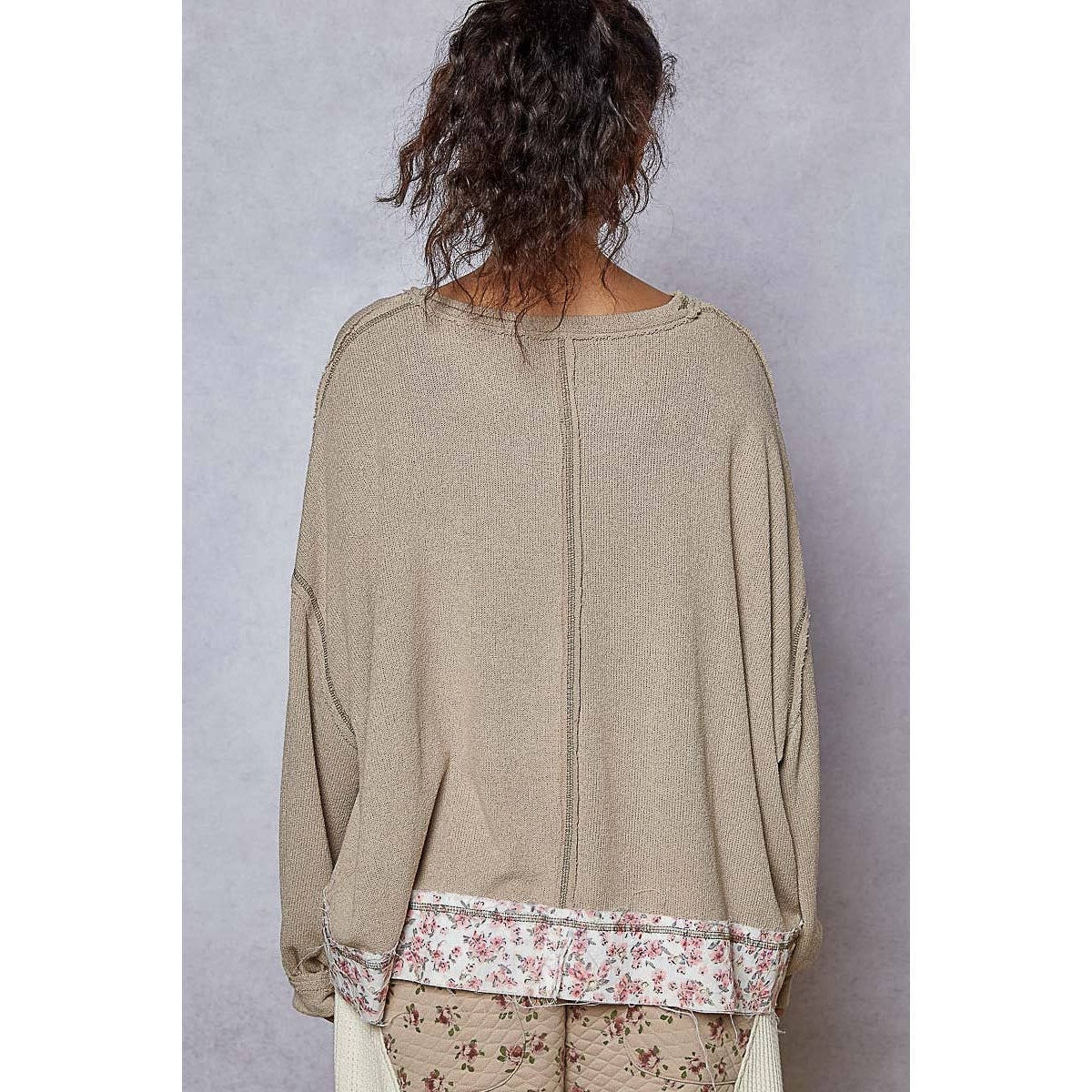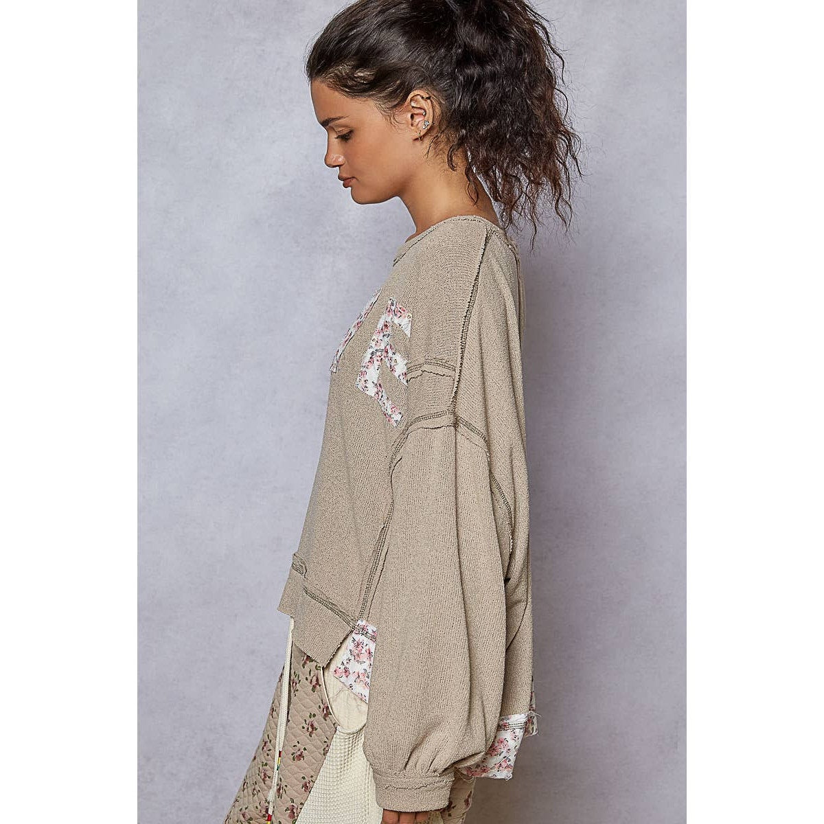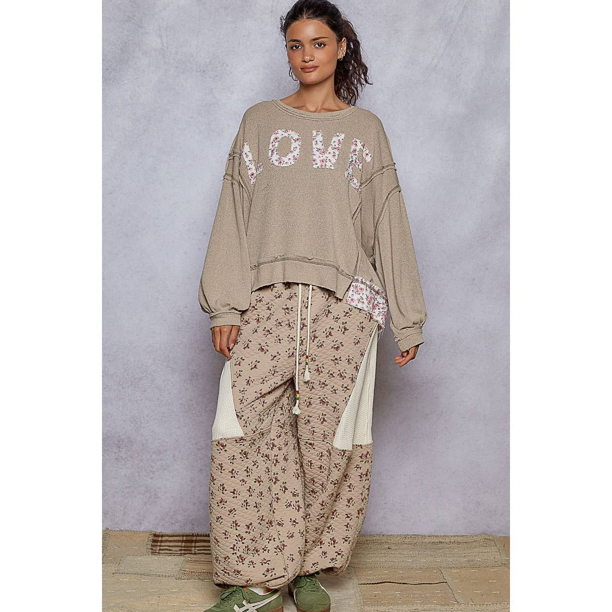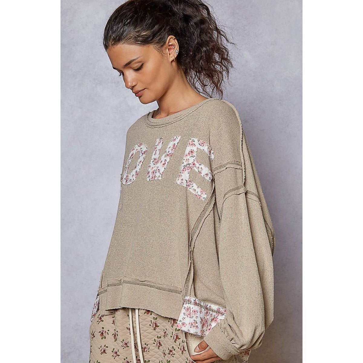 Designed in round neck long sleeve regular fit top in cut and sew sweater knit with out seam, LOVE letter patch, overlock stitch point, out seam detail, vintage washing, solid color.