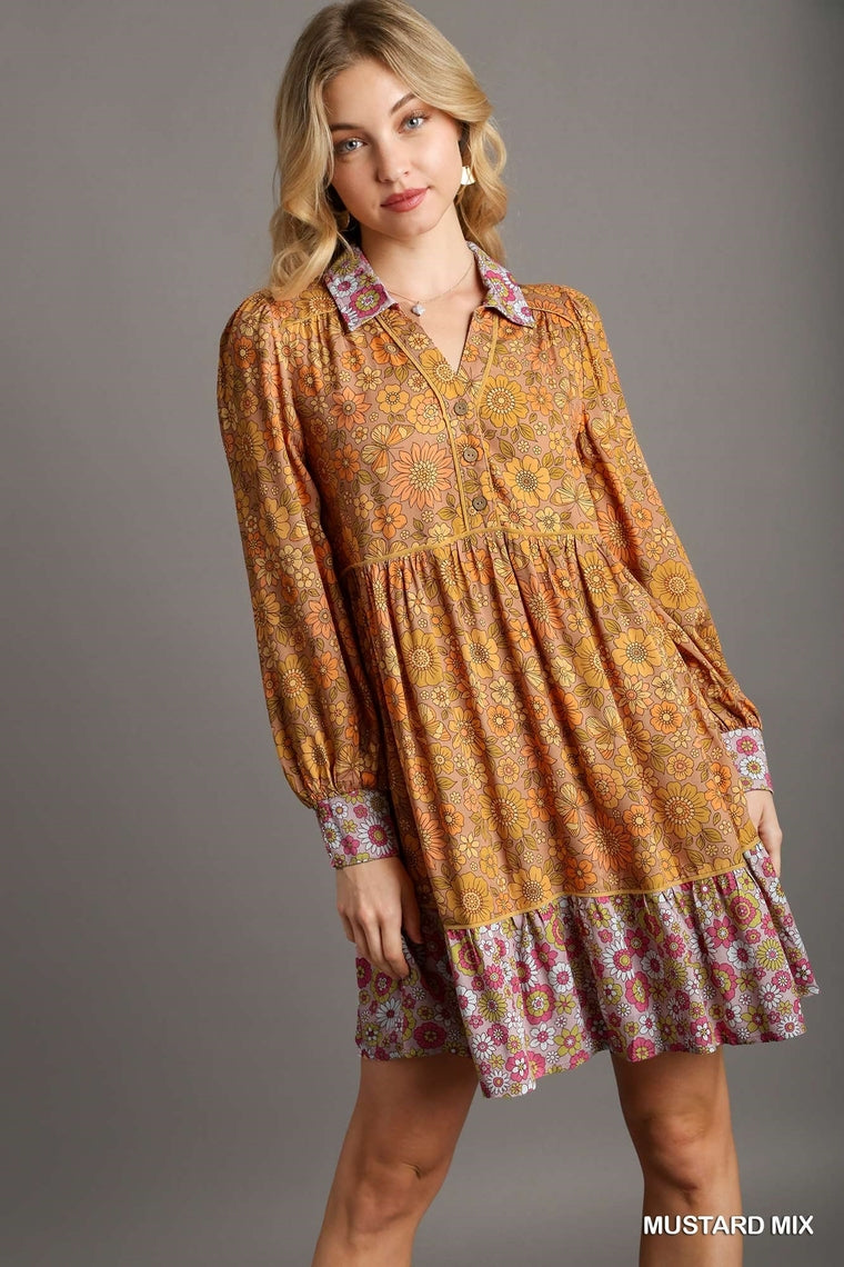 Mix Match Floral Print Collared Neck Dress with Ruffle