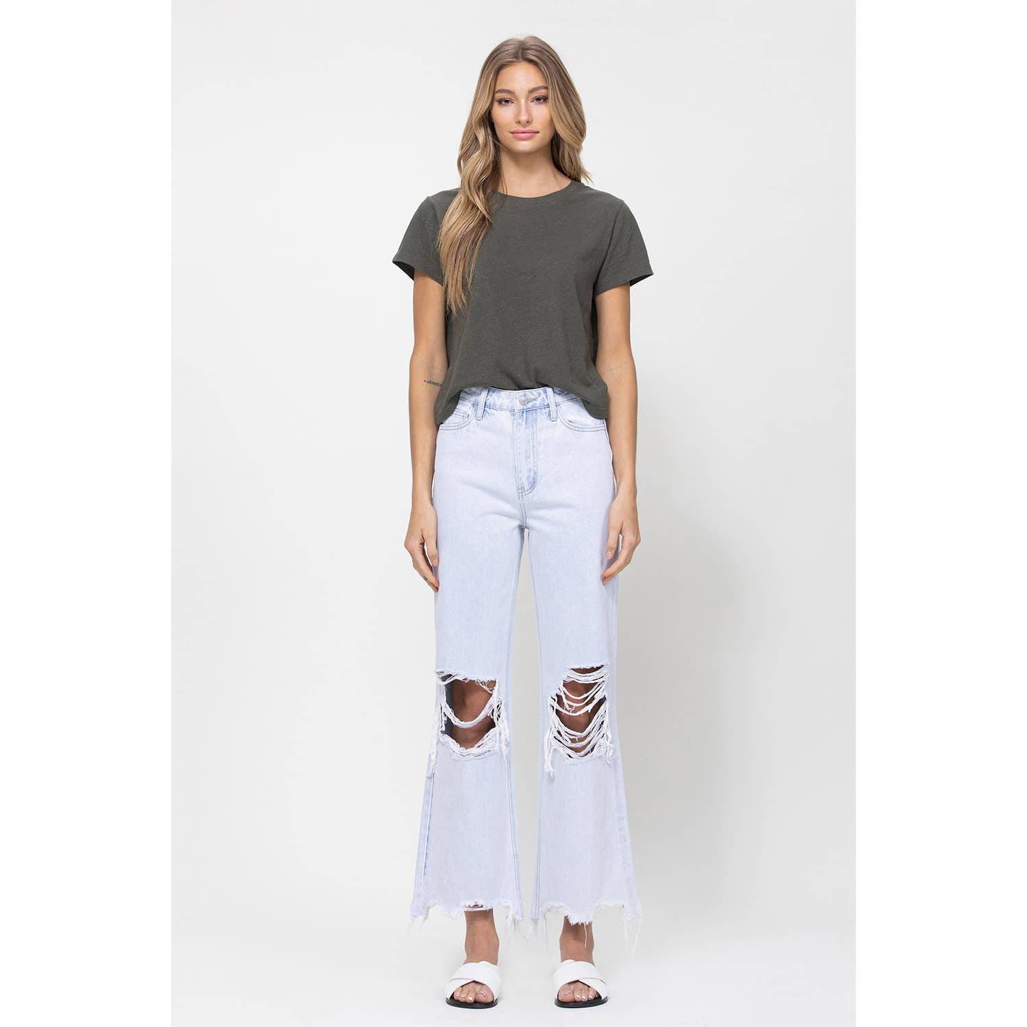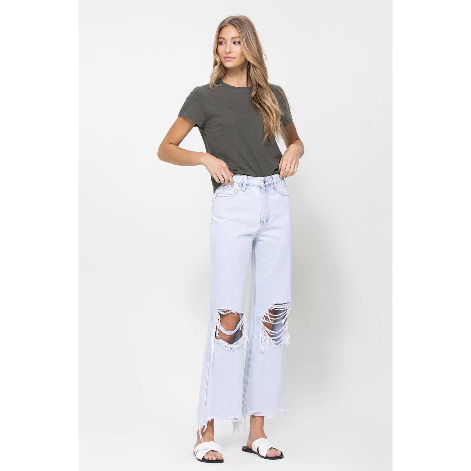 These comfortable super high-rise straight leg jeans have destroyed and distressed details with a raw hem. This worn-in look creates a flattering, on-trend style.- Relaxed straight leg jeans, 28" Inseam