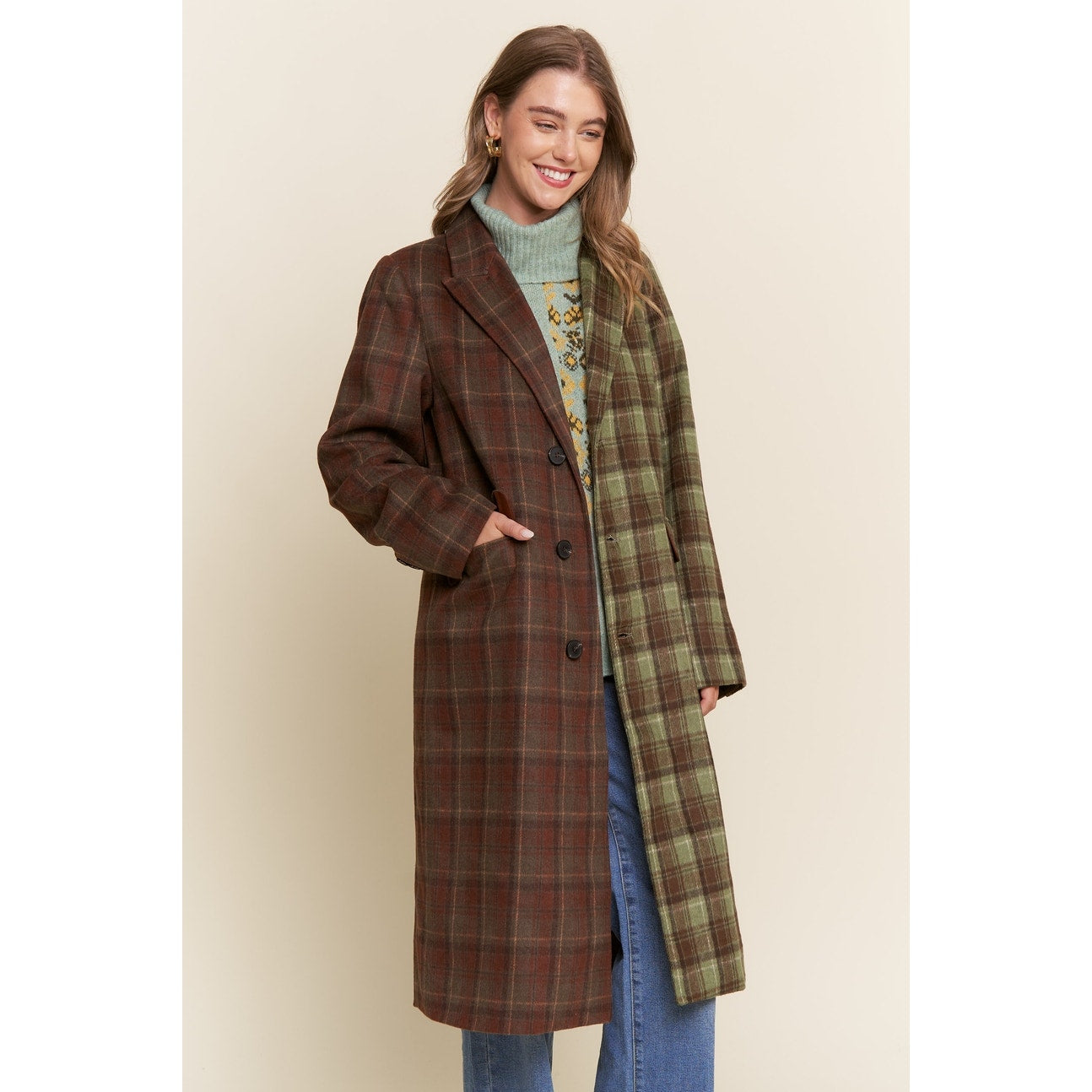 Plaid Two-Tone Midi Length Coat
