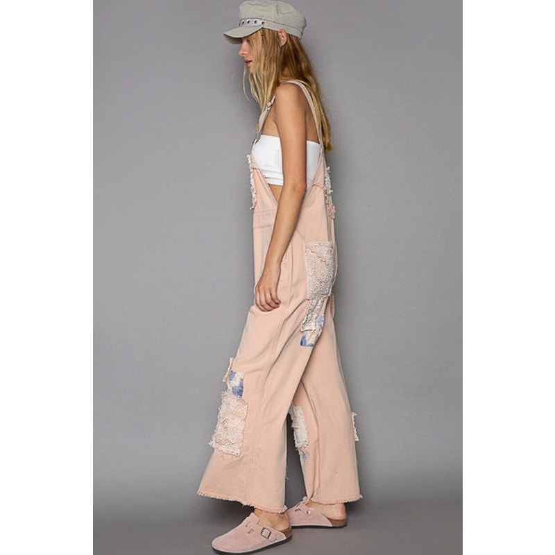 Salmon Pink Crochet Patchwork Detail Casual Denim Overalls