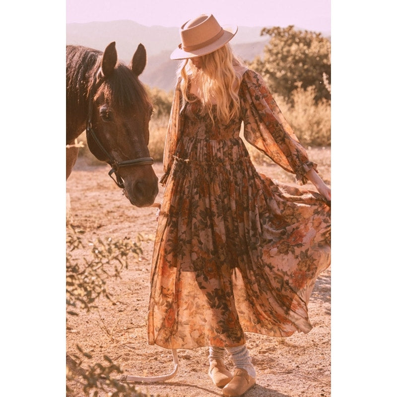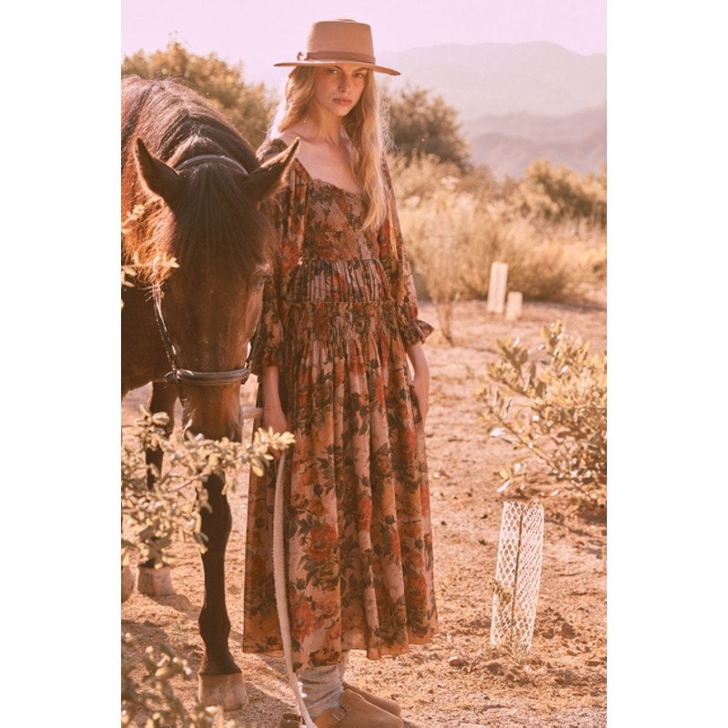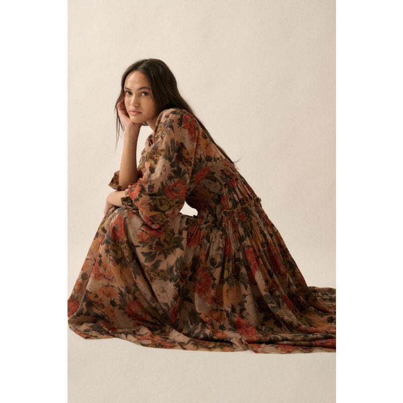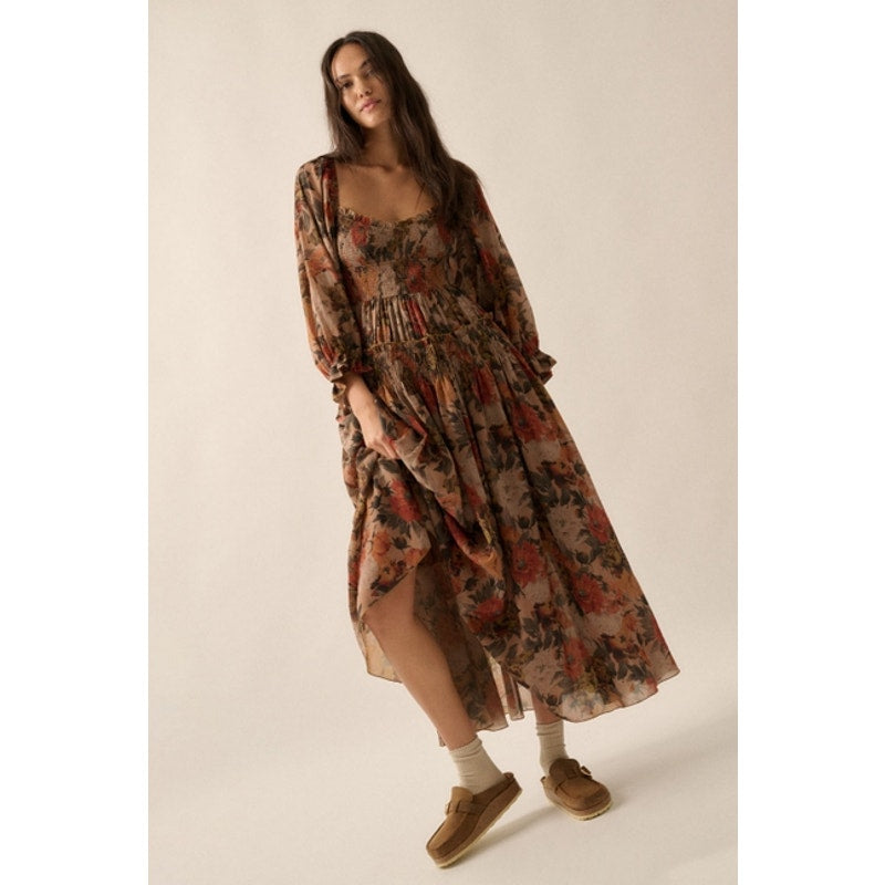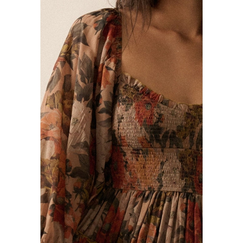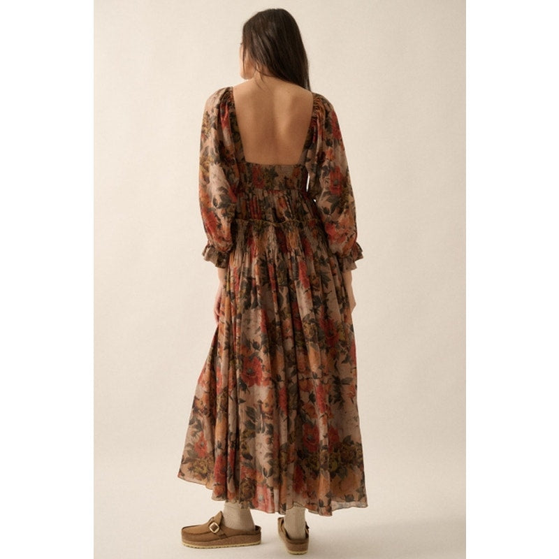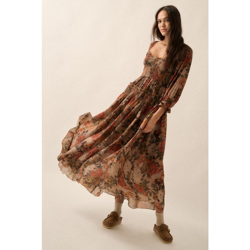 Sand Floral Smocked Three-Quarter Sleeve Maxi Dress