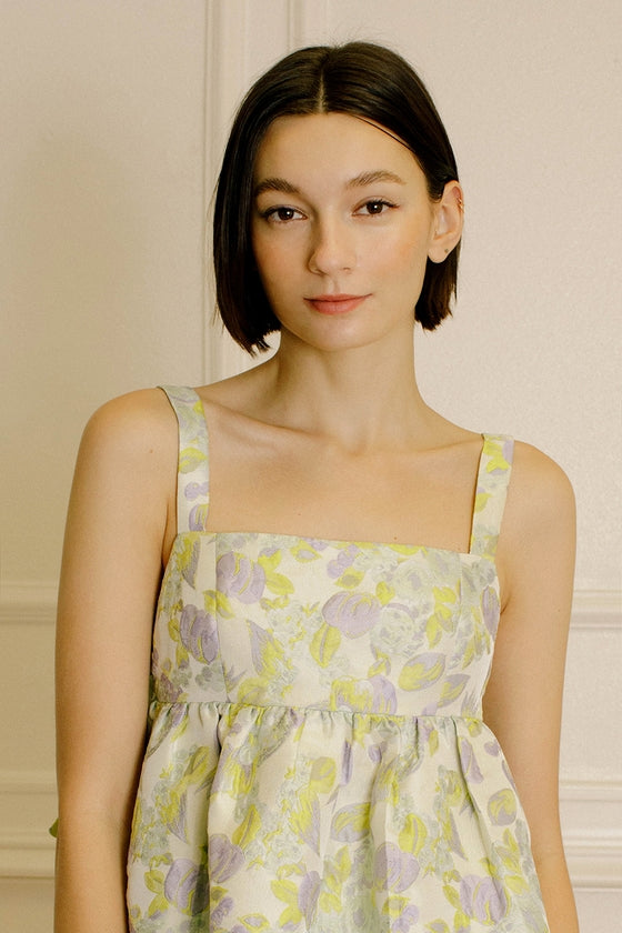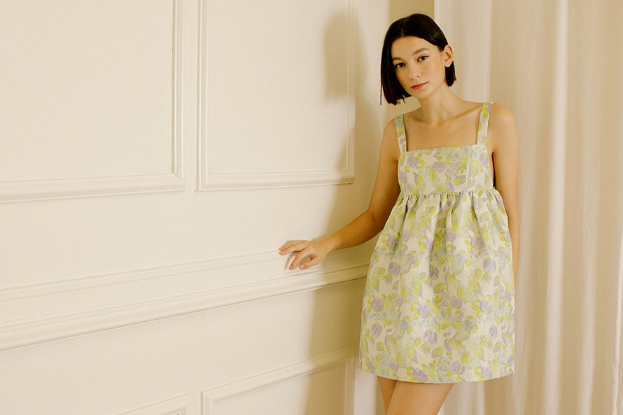 Embroidered print baby doll mini dress. It features a straight neckline, bust darts, and self-tie ribbon straps. It also has a gathered empire waist and low back.