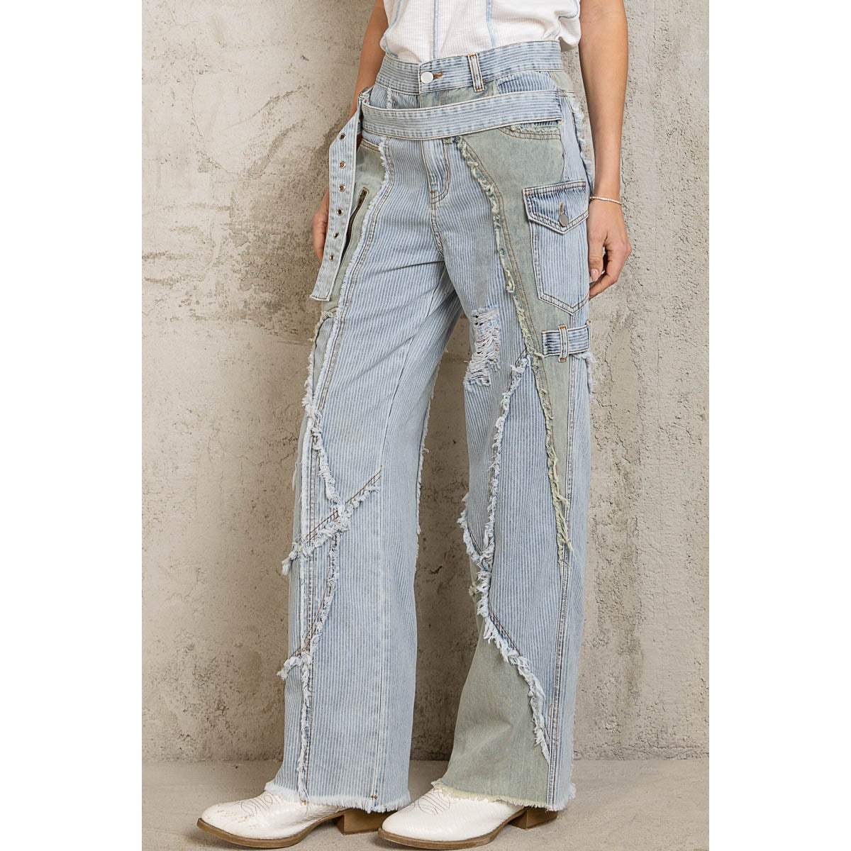 Striped Belted Frayed Seam Distressed Straight Denim High Waisted Jeans