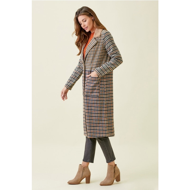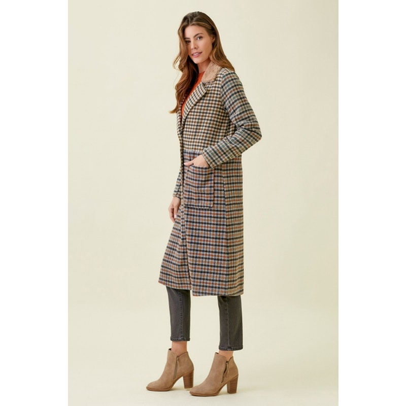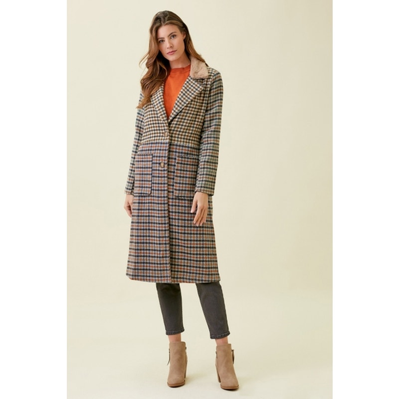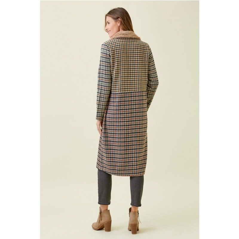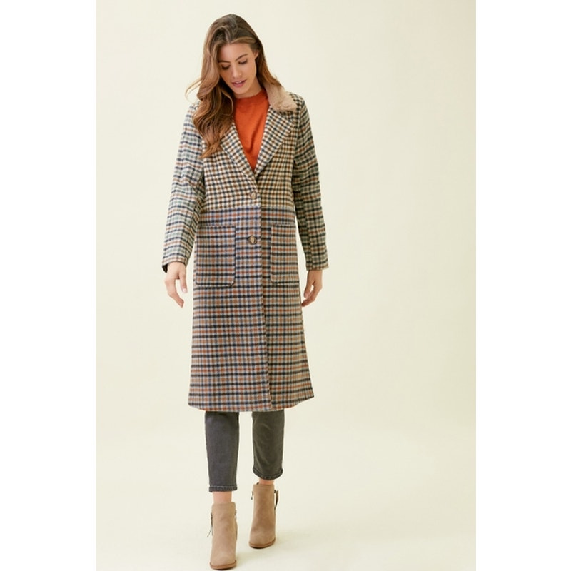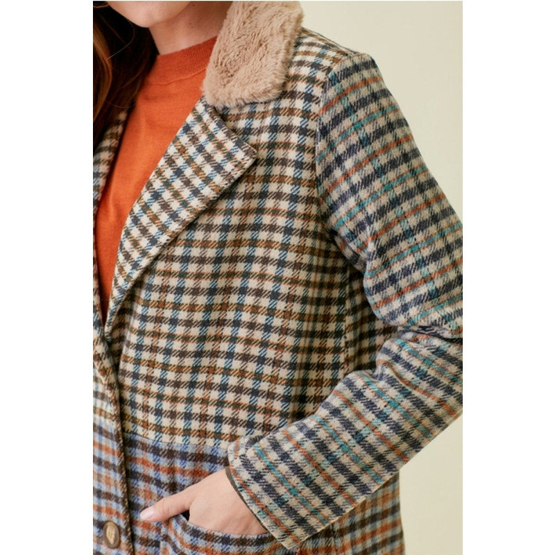 Taupe Mix Plaid Long Coat with Faux Fur Collar