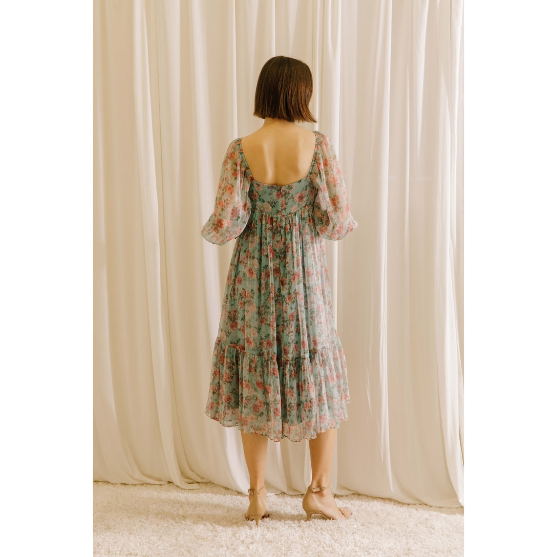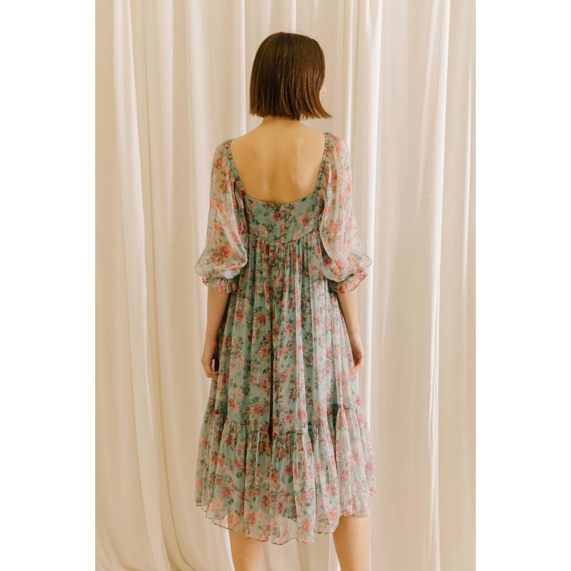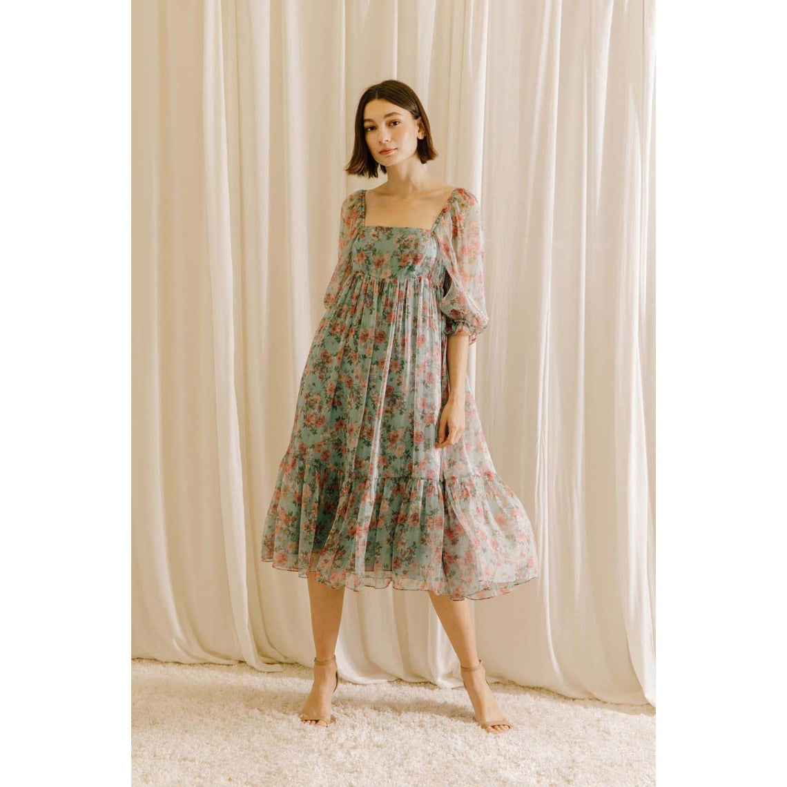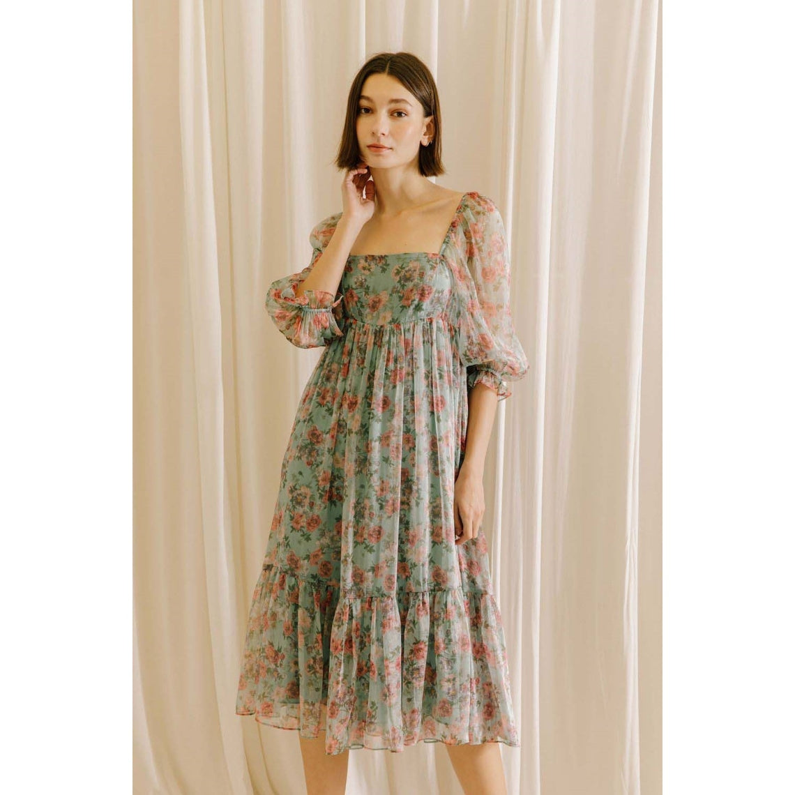 Rose floral print midi baby doll dress. It shows a square neckline, 3/4 sleeves, and bust darts. It also has a gathered empire waist, ruffled hem, and an invisible zipper.